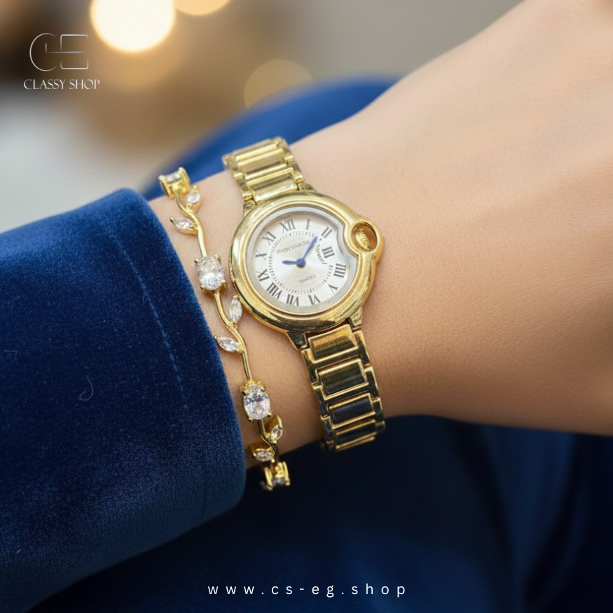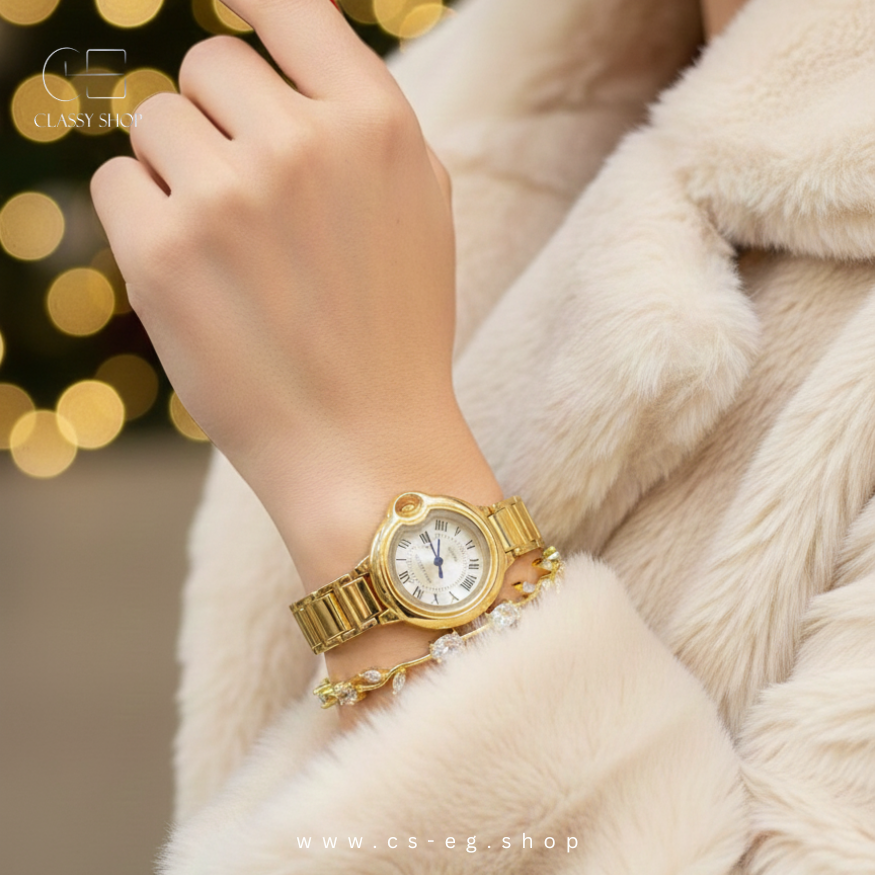 استمتعي بالأناقة الكلاسيكية مع هذه الساعة النسائية الراقية ذات التصميم الذهبي الجذاب. تجمع بين الفخامة والبساطة لتناسب الإطلالات اليومية والسهرات الخاصة