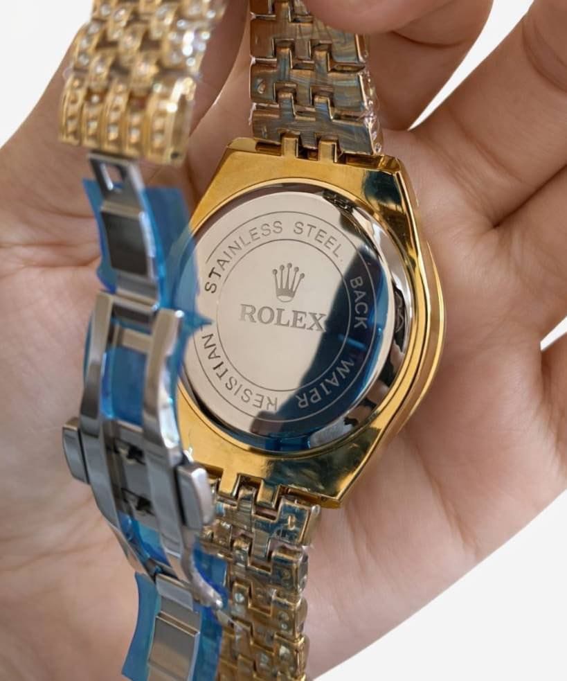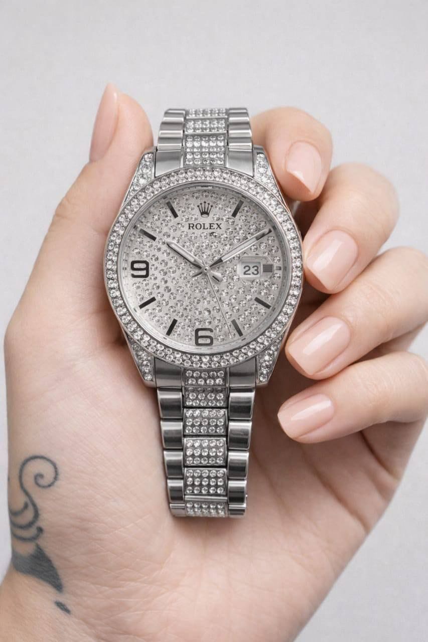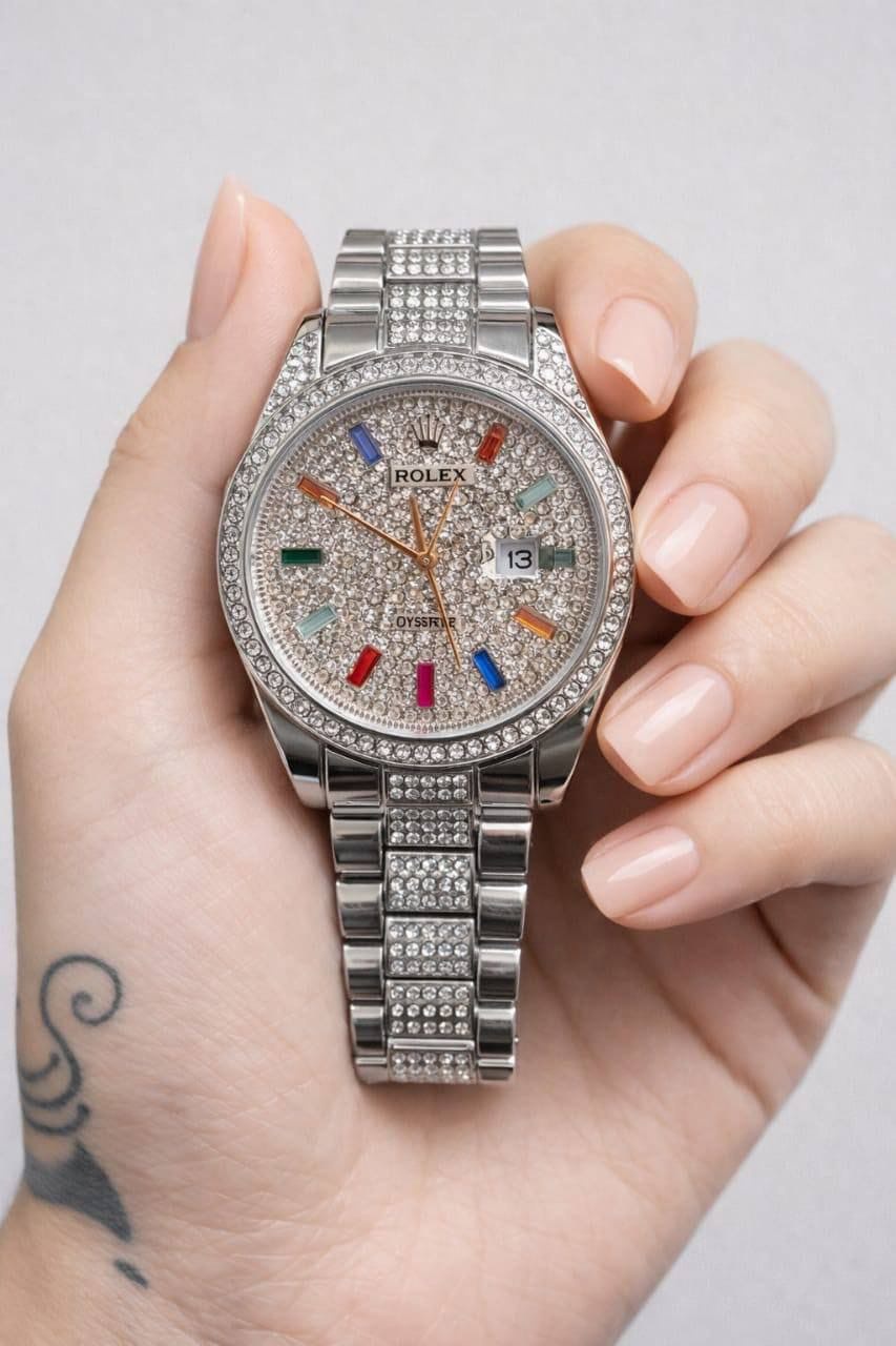 القرص المرصع بالكامل يضيف لمسة لامعة تخطف الأنظار، مع إطار وسوار معدني متين يعطي إحساس بالقوة والرقي في نفس الوقت.