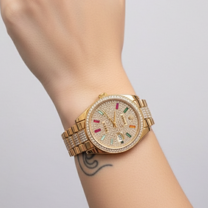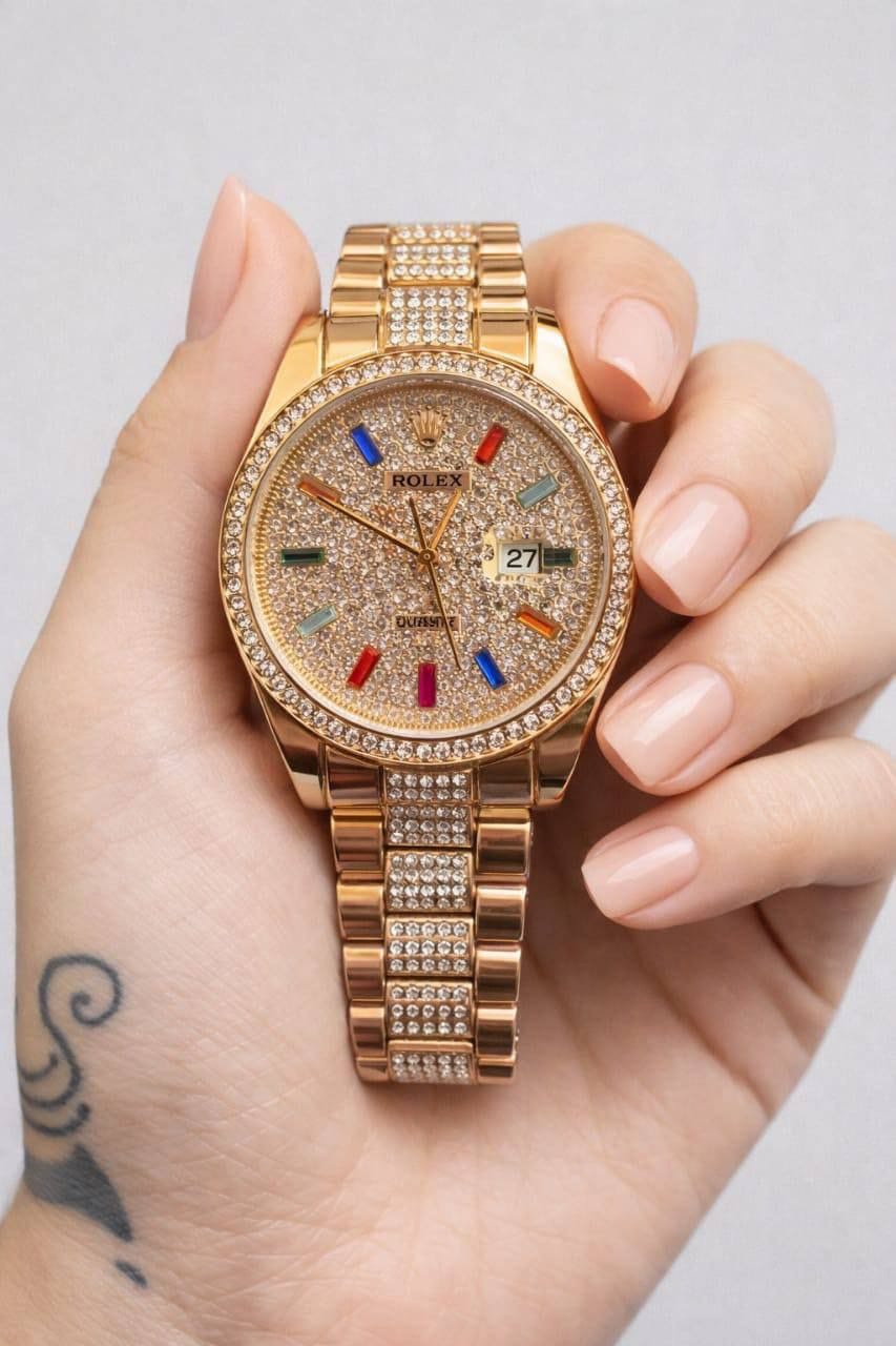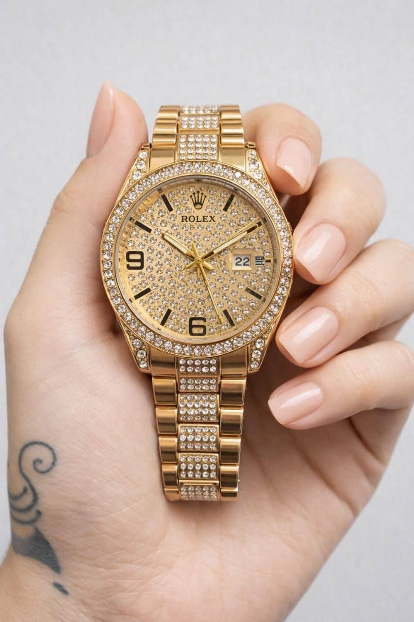 ساعة يد فاخرة بتصميم ذهبي مرصّع بالكريستال، بتجمع بين الأناقة الجريئة والفخامة الراقية.