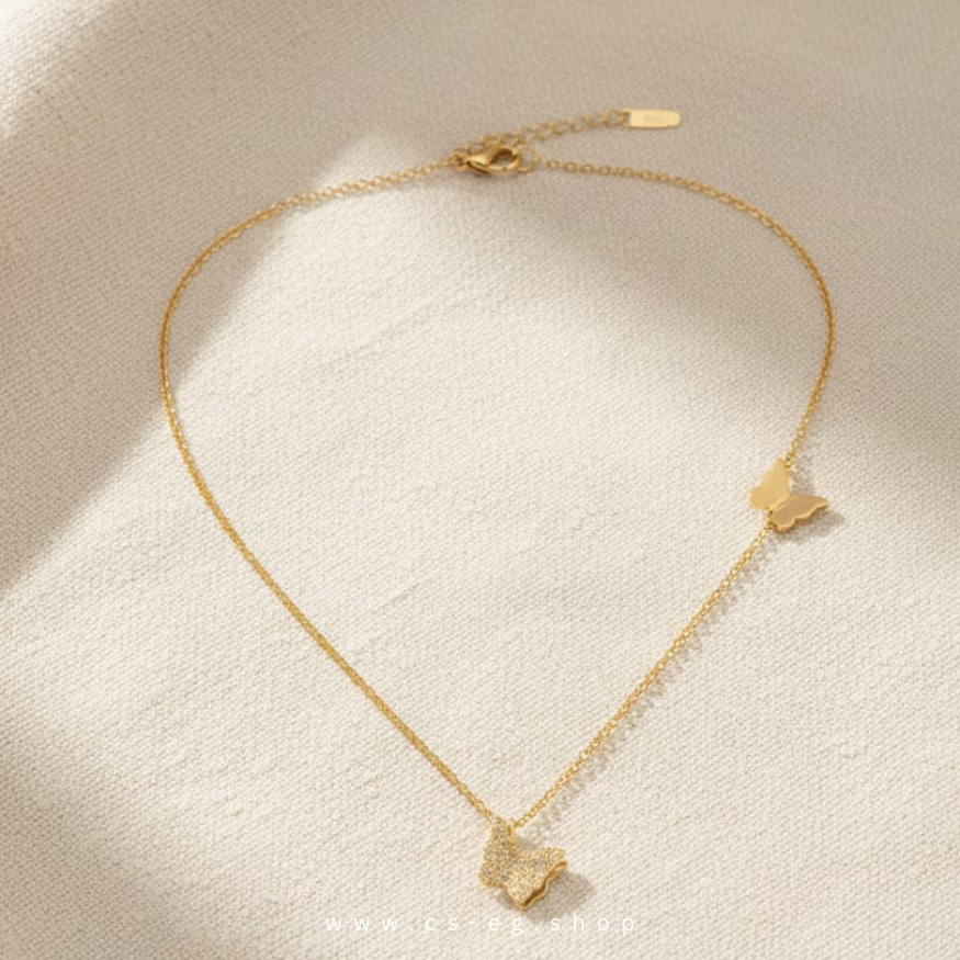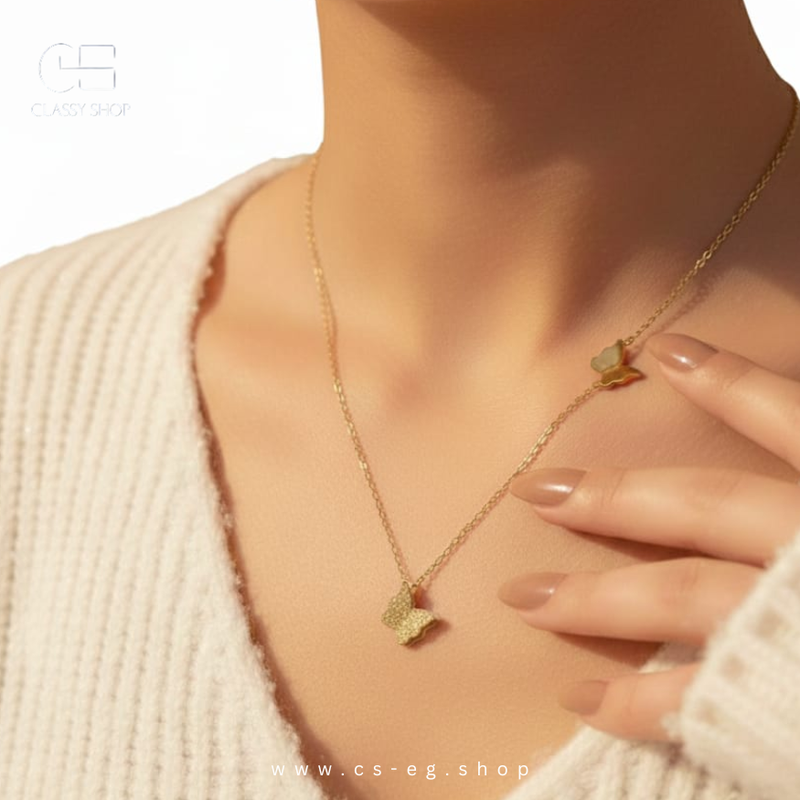 قلادة ذهبية بتصميم فراشة أنيق، تضيف لمسة رقة وفخامة لإطلالتك اليومية. خفيفة، ناعمة، وتناسب كل الأذواق ✨