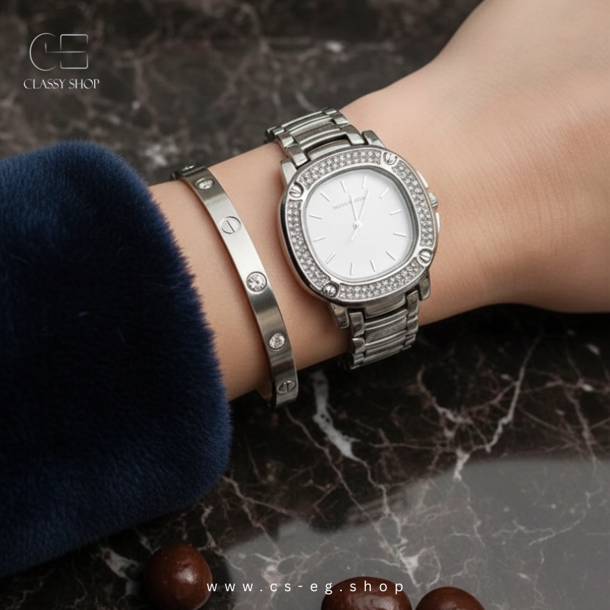 الطقم مكوّن من ساعة شيك + أسورة استانلس ستيل 316 داخل بوكس أنيق يناسب الهدايا والمناسبات الخاصة