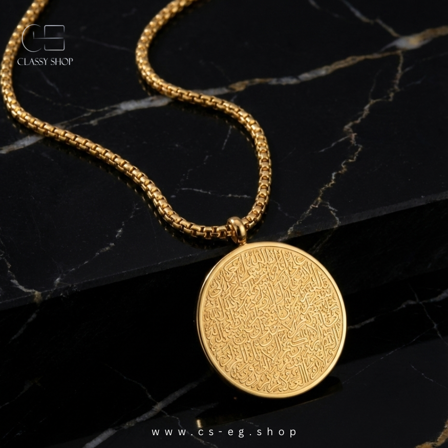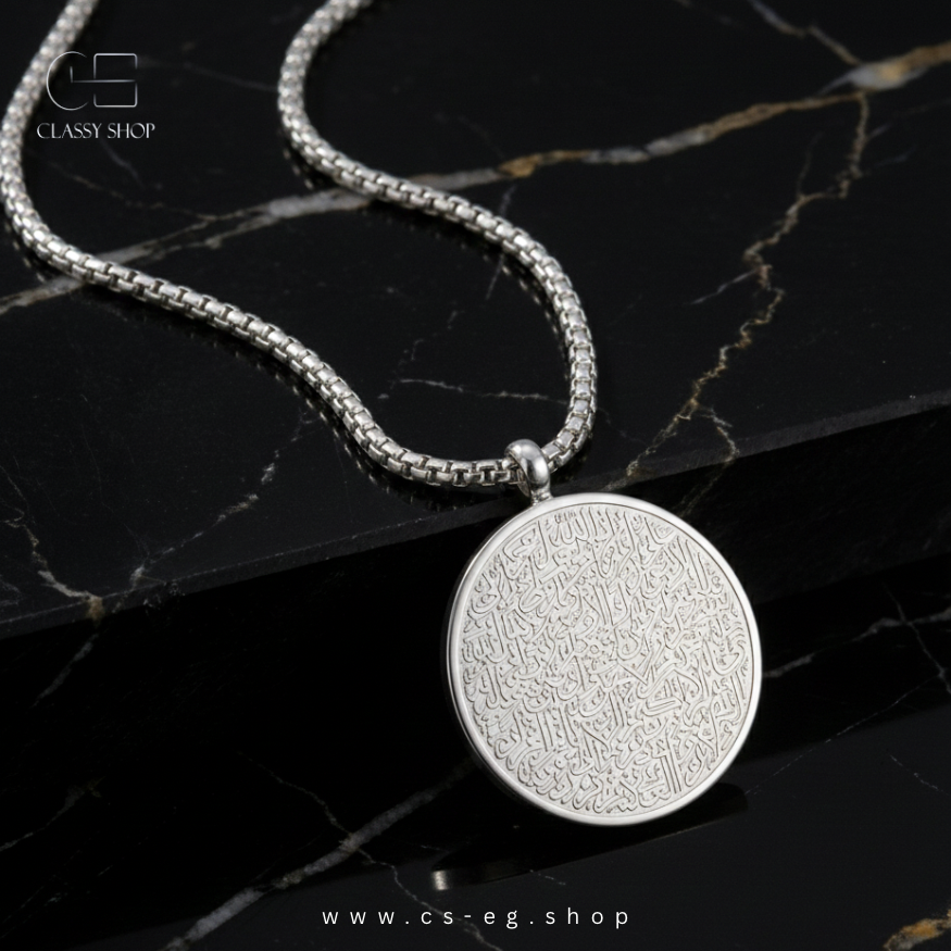 سلسلة آية الكرسي المستديرة بتصميم كلاسيك أنيق يرمز للكمال والاستمرارية، مع نقش دقيق لآية الكرسي يمنح إحساسًا بالطمأنينة والحفظ.