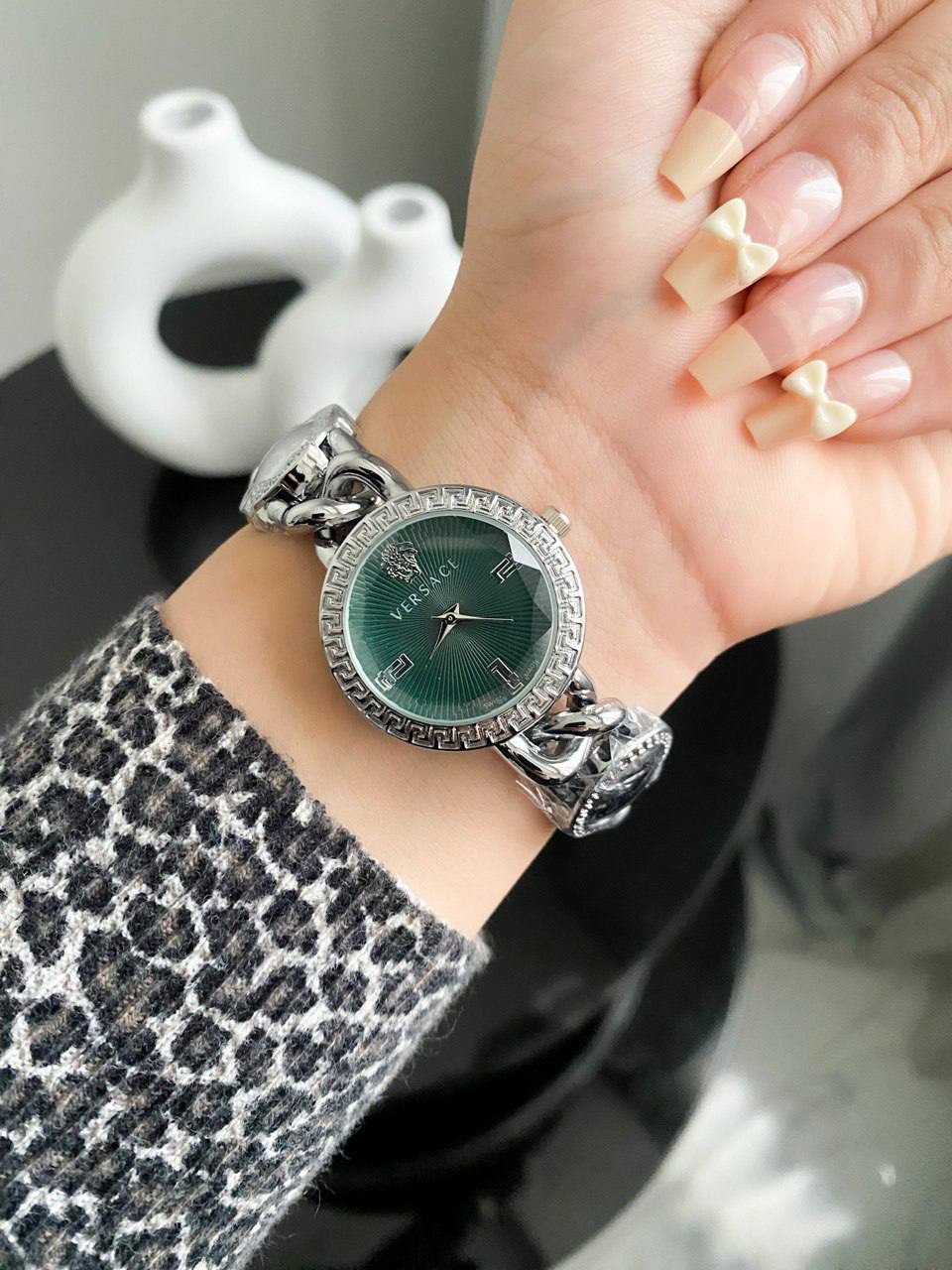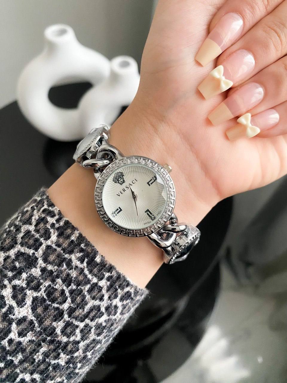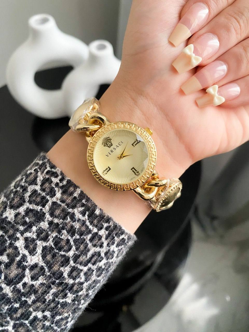 ساعة أنيقة بتصميم أيقوني يحمل توقيع دار الأزياء العالمية Versace.